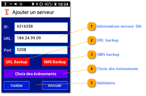 Renseigner l'identifiant à transmettre, l'adresse IP ou l'URL et le port du serveur de réception.